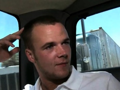 Raunchy pecker riding with two gay hunks at the car park